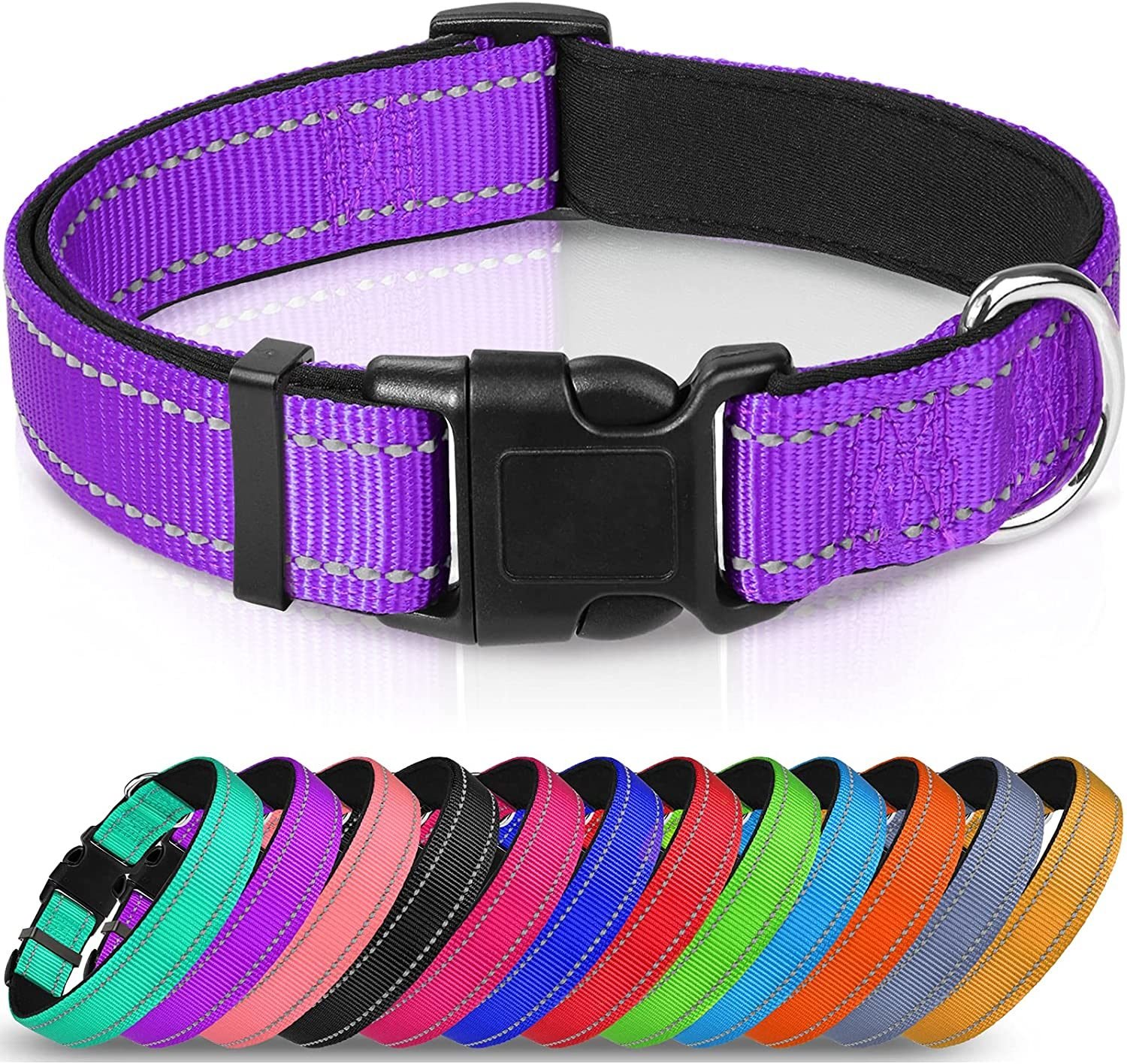 SAFETY: Highly reflective threads keep high visibility at night for safety.And you can easy find your furry pet in the back yard at night MATERIALS: Dog collar is made of nylon with padded neoprene rubber material. This material is durable; fast dries; flexible and ultra soft CLASSIC: This nylon dog collar is a classic yet stylish collar that comes in 12 colors and 5 sizes so you can find just the right one for your dog. A separate loop on the collar makes it easy to add dog tags and leashes onto the collar CONVENIENT: Quick release premium ABS made buckles; easy to adjust length and put it on/off. The plastic buckle is curved for your dog's comfort SIZE: X-Small Width 5/8"; Neck Size 8"-12"; Small Width 3/4"; Neck Size 12"-16"; Medium Width 1"; Neck Size 14"-20"; Large Width 1"; Neck Size 16"-24"; XLarge Width 1 1/4"; Neck Size 18-28"