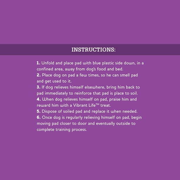 Keep your floors safe with the help of the Vibrant Life training pads. Their built-in attractant allows for easy training, and they contain an odor neutralizer. The top layer dries quickly, while the bottom layer prevents leaks. Each pad can quickly absorb up to two cups of liquid, keeping your floors safe and dry. when you have welcomed a brand-new puppy to your home, being proactive is a must, and these pads can help. Simply unfold and place the pad with the blue plastic side down, in a confined area, away from your pooch's food and bed. Place your pup on the pad a few times so he can smell it and get used to it. If he happens to relieve himself elsewhere, bring him back to the pad immediately to reinforce that the pad is the place for the soil. When your good boy relieves himself on the pad, praise him and be sure to reward him with a Vibrant Life treat. Make house training a little easier and keep your floors dry with Vibrant Life training pads.